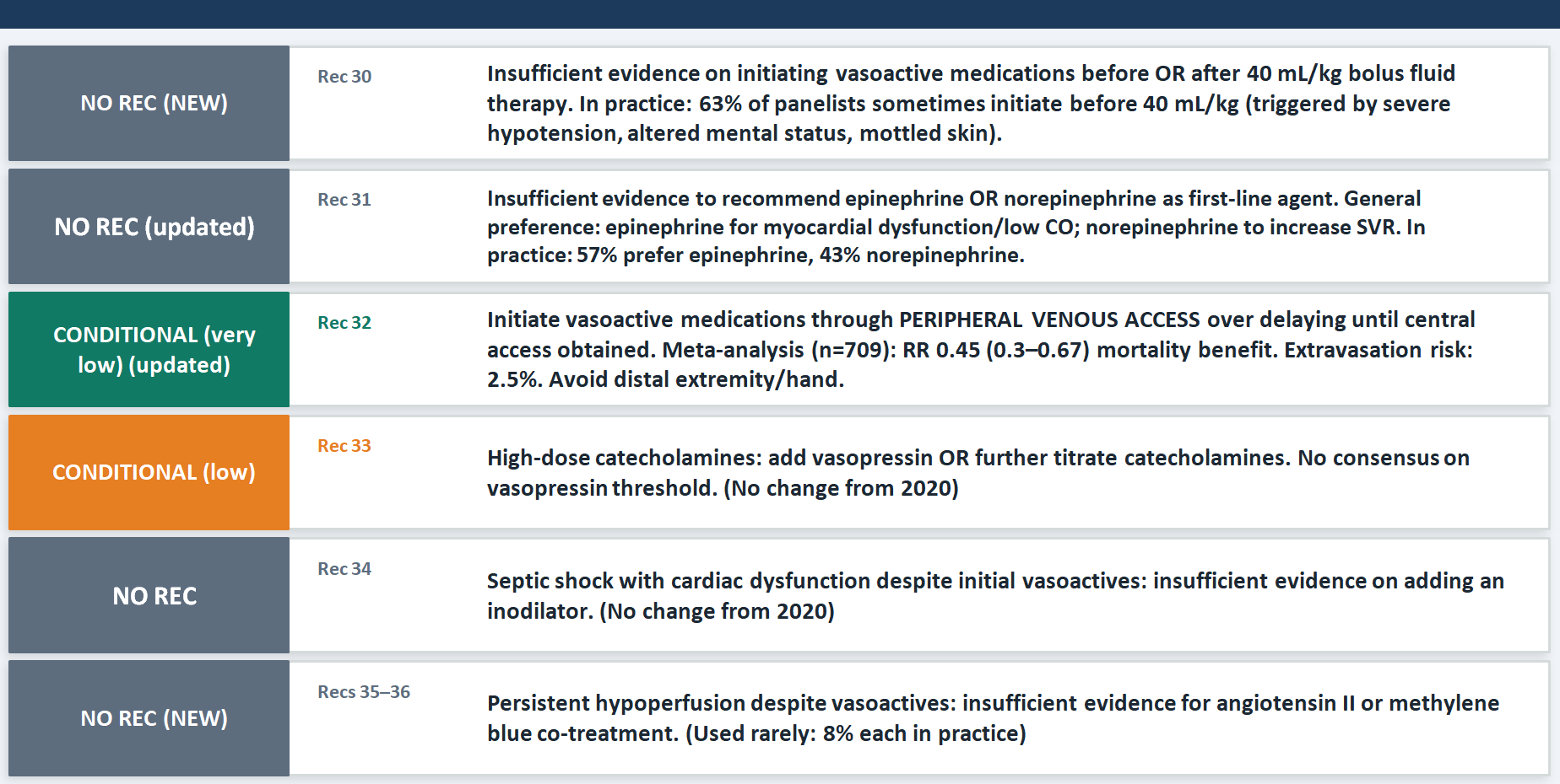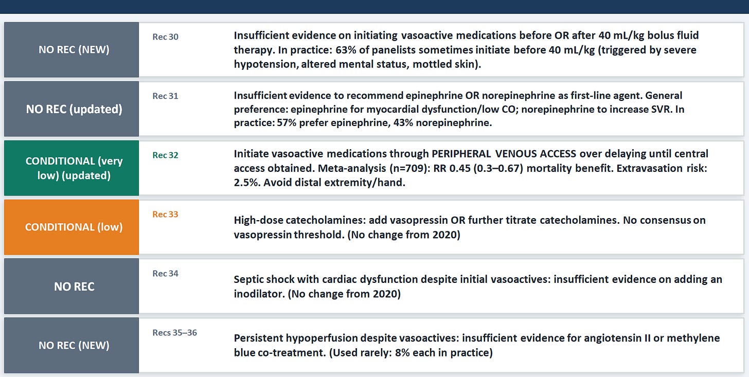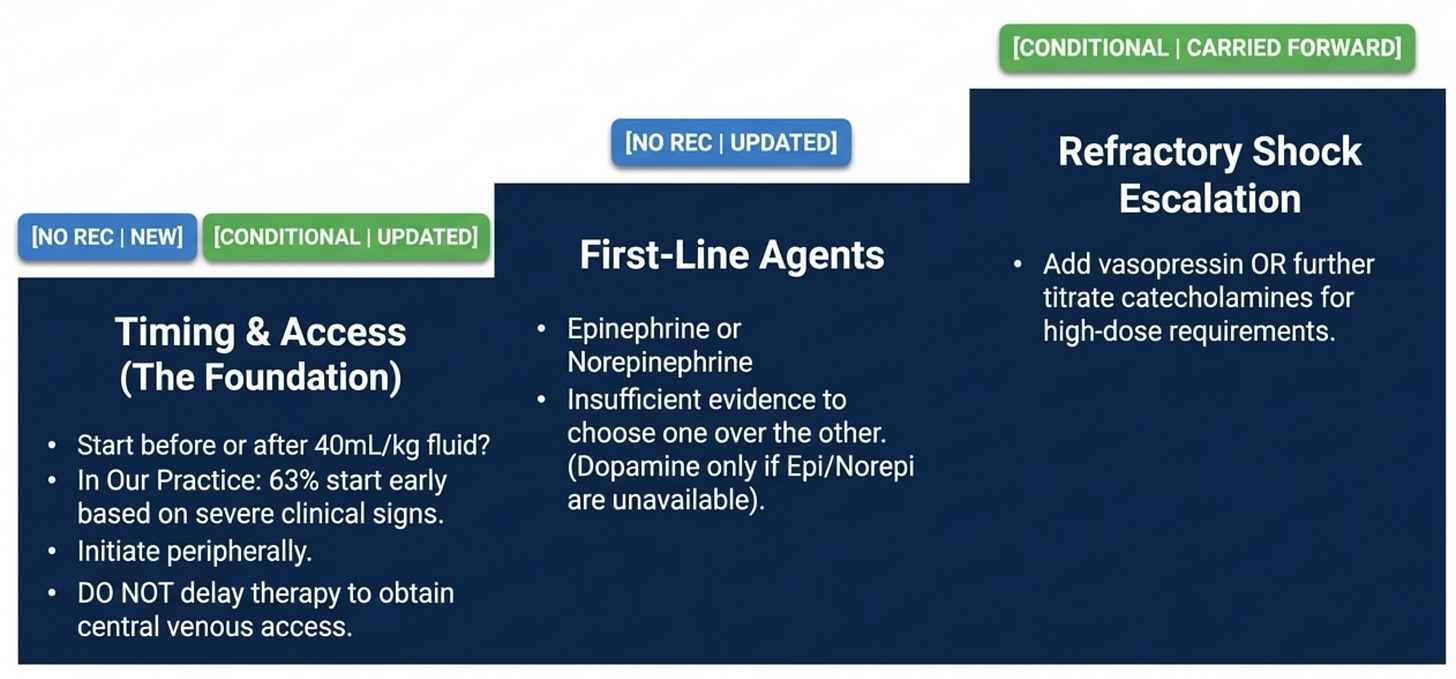 Two paradigm shifts stand out. The first is the shift on timing: there is now no recommendation either for or against starting vasoactives before 40 mL/kg of fluid (Rec 30), which dissolves the old "fluid first, then pressors" dogma. The emerging pilot data suggest early vasopressors may reduce overall fluid administration — which itself may reduce fluid overload harm. The second shift is the strong conditional recommendation to use peripheral venous access for vasoactives rather than waiting for central access (Rec 32), with a meta-analytic mortality benefit of RR 0.45 and an extravasation risk of only 2.5%. The practical teaching point is that the instinct to wait for central access before starting pressors is costing time that children may not have, especially in the pre-ICU environment.
