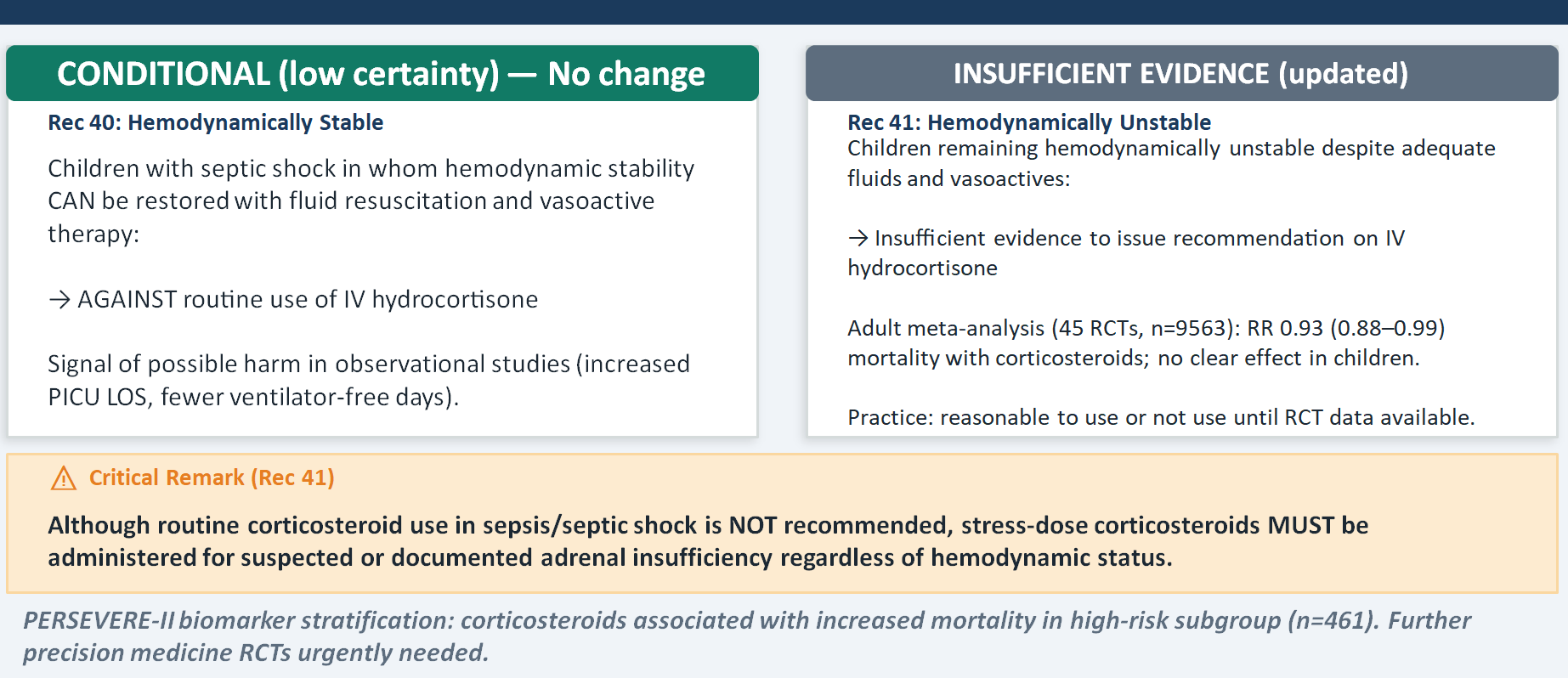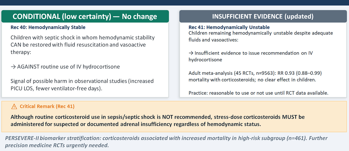 Even though the panel could not recommend hydrocortisone for hemodynamically unstable children (insufficient evidence), stress-dose corticosteroids must be given for suspected or documented adrenal insufficiency regardless of hemodynamic status. These are different clinical situations and conflating them causes harm in both directions — over-prescribing in ordinary shock and under-prescribing in relative adrenal insufficiency. The retreat from the 2020 "either/or" language for unstable shock reflects new observational data suggesting possible harm from corticosteroids in children — including longer PICU stays, fewer ventilator-free days, and in biomarker-stratified analyses, increased mortality in high-PERSEVERE-II-score patients. The evidence base here is still weak, but the signal is worrying enough to have updated the language.