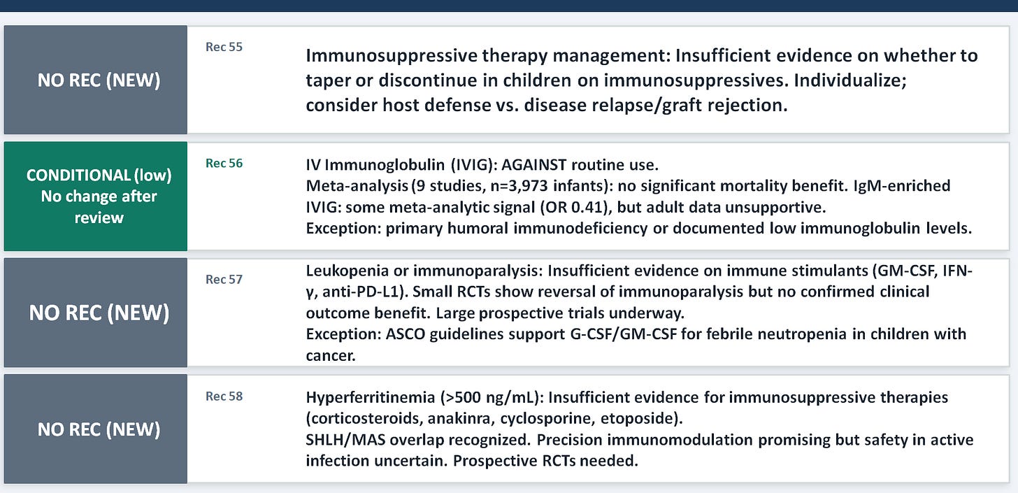 The section on hyperferritinemia (Rec 58) is the most intellectually exciting new addition in this domain. It represents the field beginning to grapple with precision immunomodulation — the recognition that sepsis is not immunologically uniform, and that children with features of secondary HLH, macrophage activation syndrome, or cytokine storm may need immune suppression rather than immune stimulation. But the panel is appropriately cautious: most data come from non-sepsis populations (rheumatologic disease, malignancy), and the safety of immunosuppression in children with active infection and heterogeneous immune competence remains uncertain. The IVIG recommendation (Rec 56) reinforces a consistent message across guidelines: no routine use, but consider it in children with primary humoral immunodeficiency or documented low immunoglobulin levels.