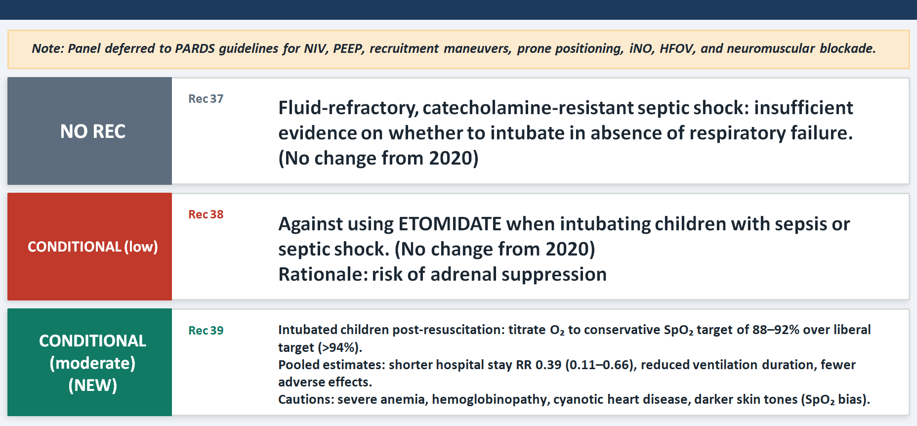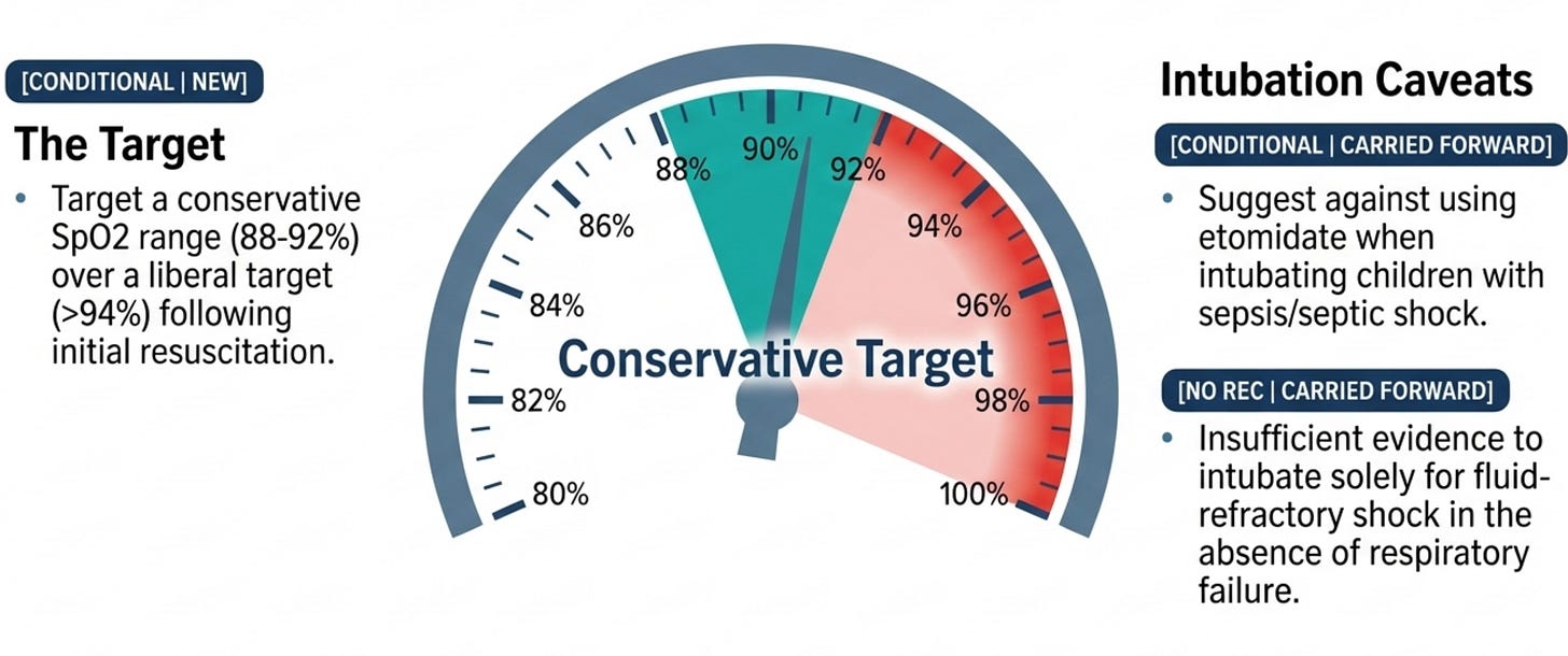 The update here is the new conservative oxygen target: SpO₂ 88–92% over greater than 94% in intubated children after resuscitation (Rec 39, conditional, moderate certainty). This is one of the three moderate/high certainty recommendations and is drawn from the OxyPICU trial and its predecessor data. The physiological logic is important to understand: hyperoxia causes free-radical damage and microcirculatory dysfunction . However, the panel correctly issued only a conditional recommendation because the target should not apply during the acute resuscitation phase, and children with hemoglobinopathies, cyanotic heart disease, or severe anemia may need individualized targets. The note about pulse oximeter bias in darker skin tones is scientifically important.