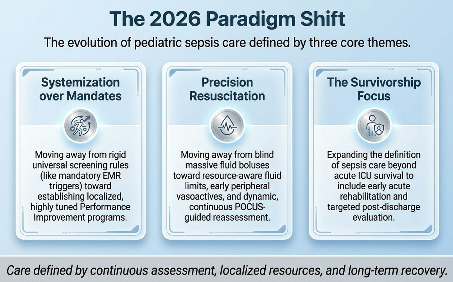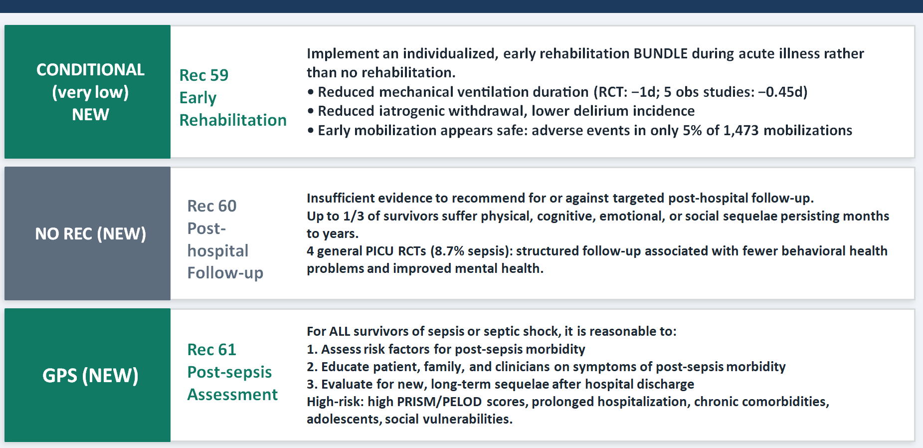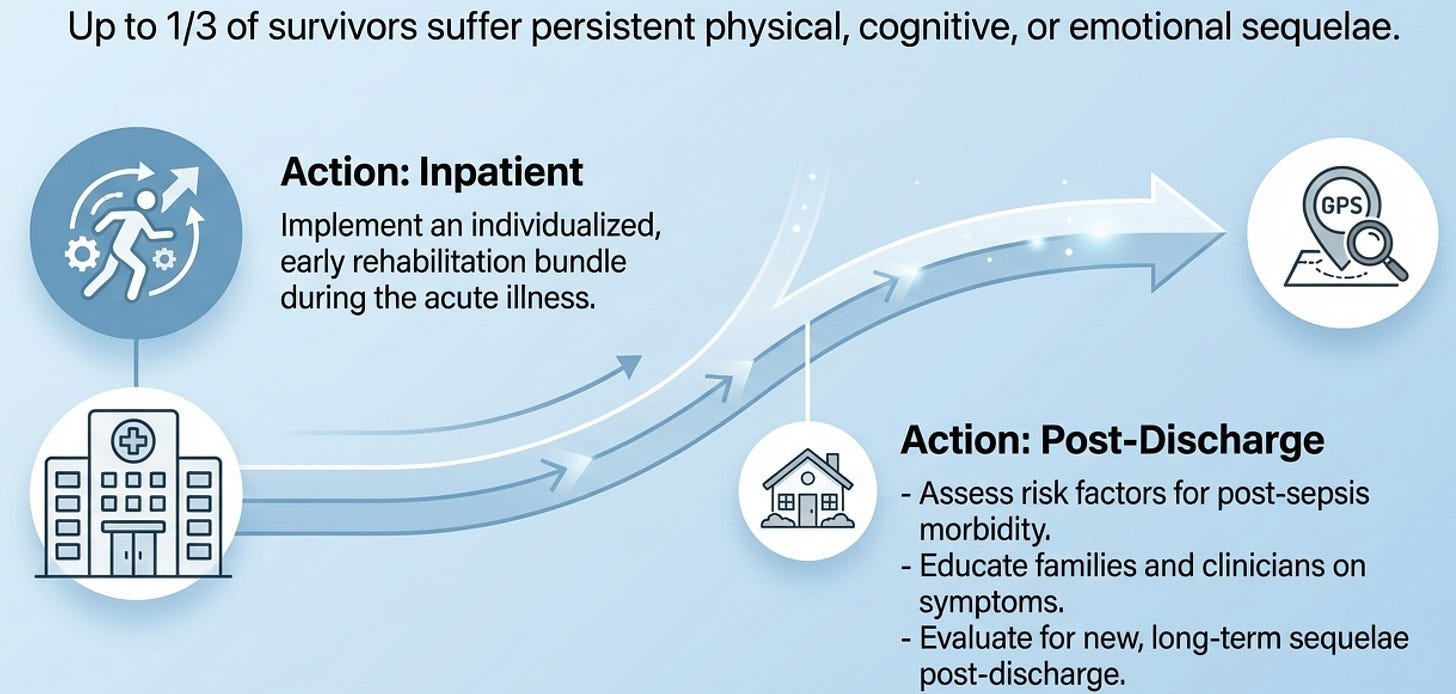 This is the most conceptually new section in the entire guideline update, and its message is almost philosophical: surviving sepsis is not the endpoint of care, it is a waypoint. Up to one-third of survivors carry physical, cognitive, emotional, or social sequelae for months to years. The early rehabilitation bundle recommendation (Rec 59) is actionable now — it includes reducing sedation, preventing delirium, promoting sleep, facilitating early ventilator liberation, and engaging families. The GPS for post-sepsis assessment (Rec 61) creates a professional obligation: screen for risk factors, educate families, and evaluate for long-term sequelae after discharge. The practical teaching point is that pediatric intensivists and emergency physicians must see their role as extending beyond the ICU walls — and that the family, not just the child, is the unit of care.