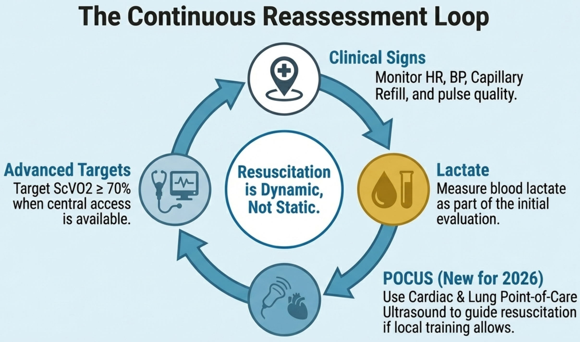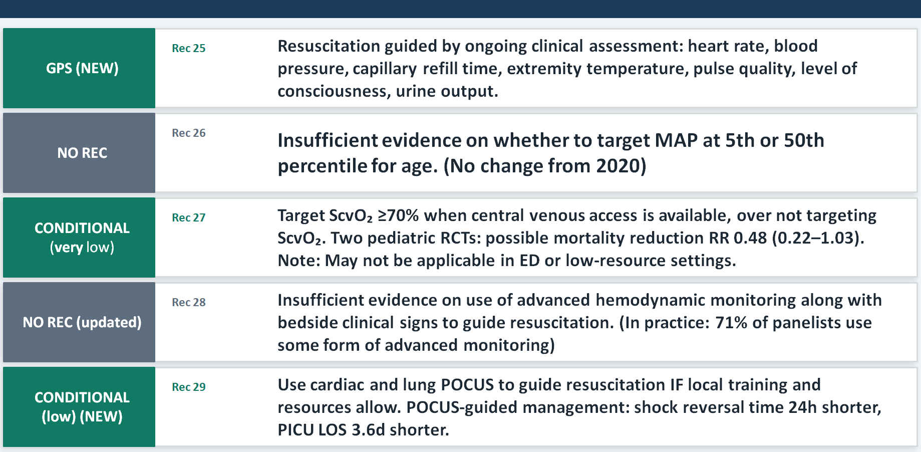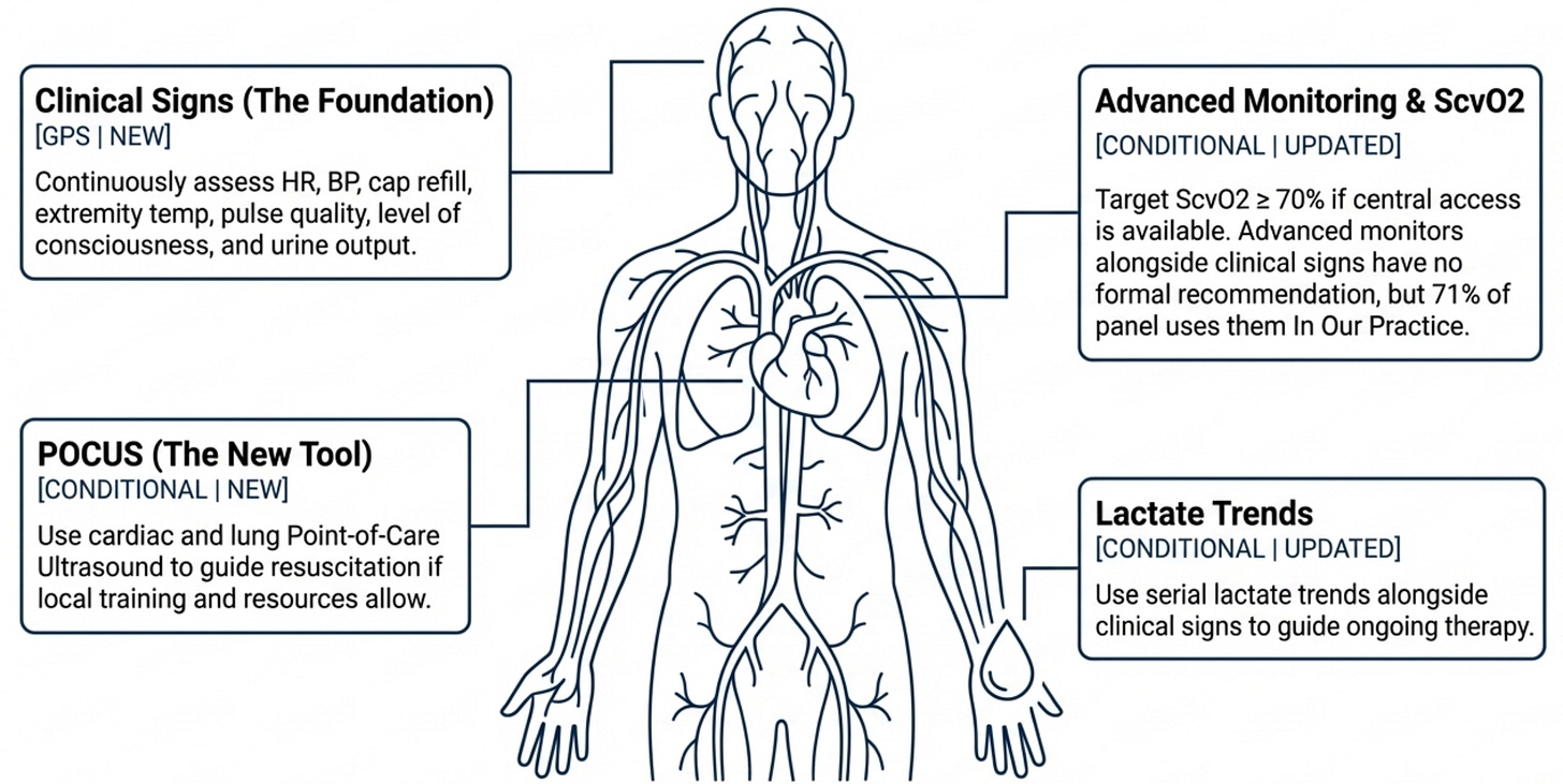 The key update is the hierarchy of monitoring: start with clinical assessment (Rec 25, GPS), use ScvO₂ ≥70% as a target when you have central access (conditional, very low certainty), reach for POCUS when training allows (conditional, low certainty, and genuinely useful — changes clinical assessment in two-thirds of cases), and recognize that advanced hemodynamic monitoring beyond this has insufficient evidence to mandate (Rec 28). The pedagogical point is that expensive technology does not automatically improve outcomes if it is not embedded in a well-trained clinical framework. The retreat from earlier EGDT-style "target everything" protocols is reflected here — even ScvO₂, which was once considered the cornerstone of goal-directed therapy, now carries only a conditional recommendation.