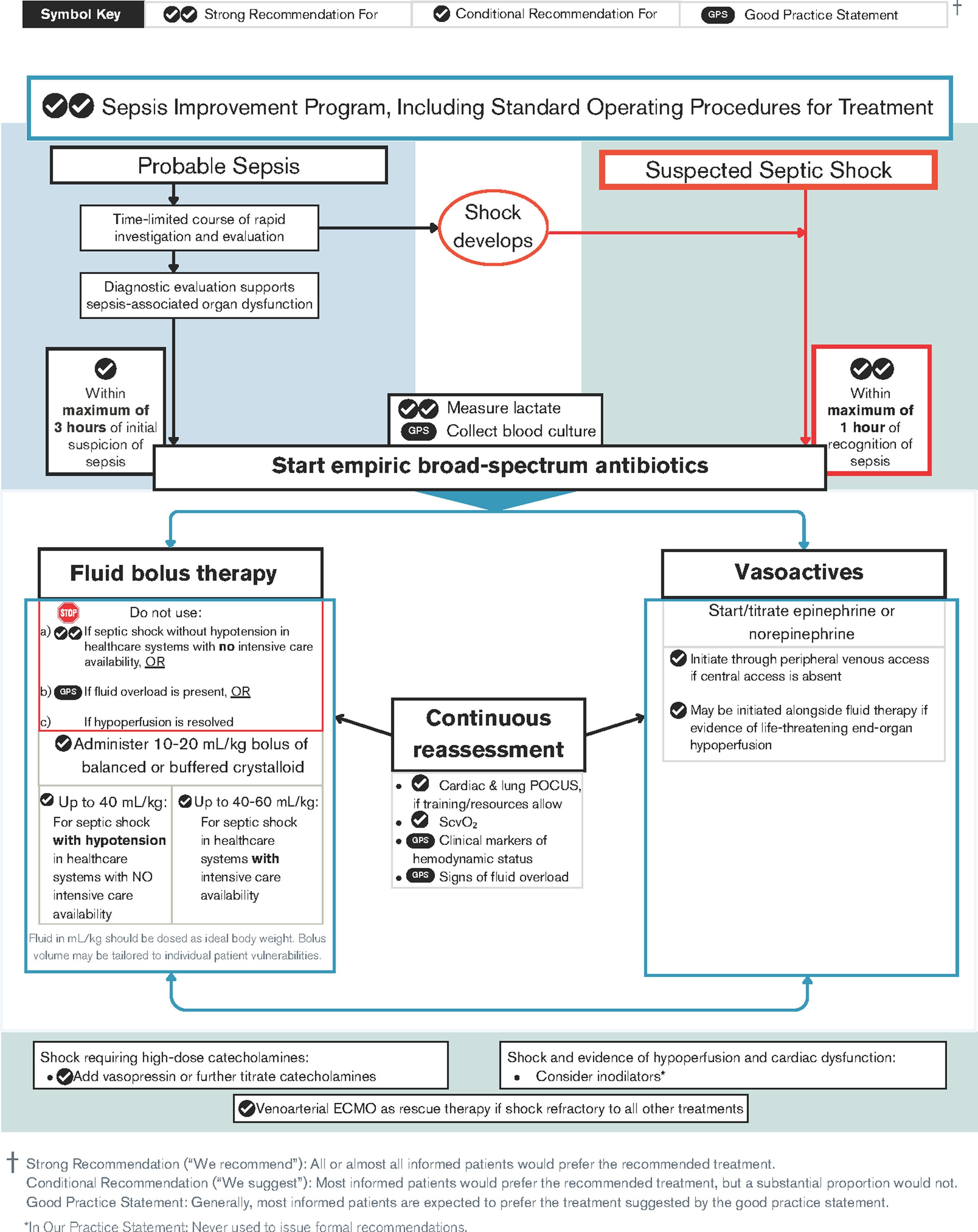 A summary of key recommendations for recognition and resuscitation with indications of the strength of recommendations. Fluid bolus therapy and vasoactive administration should be continuously reassessed.