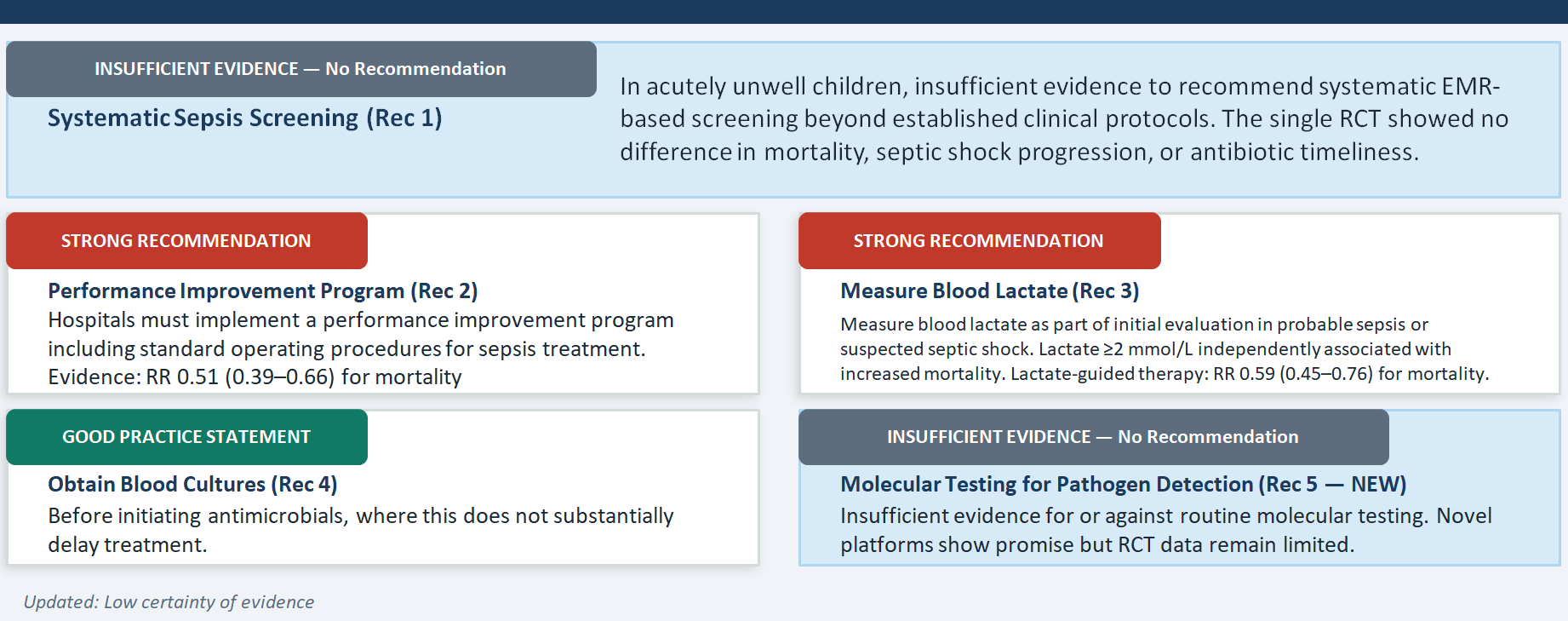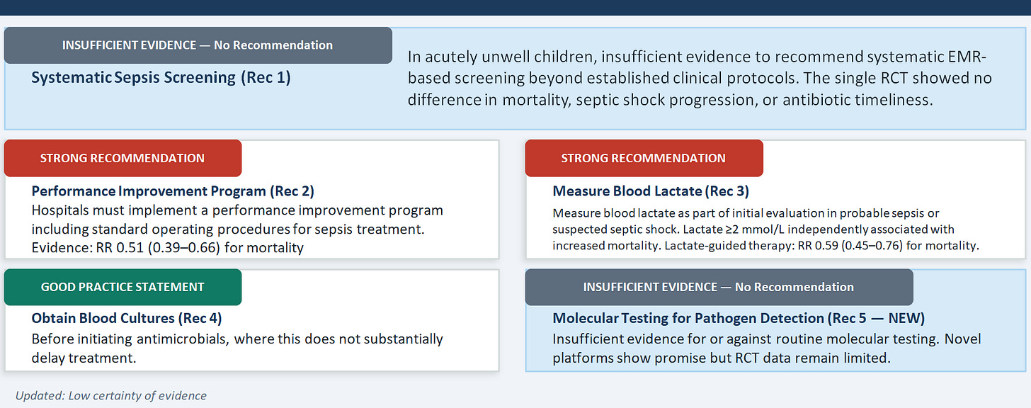 There are two important messages here that pull in slightly different directions. The first is the retreat from the 2020 guideline's suggestion to implement systematic sepsis screening — a rare case of a guideline being downgraded rather than upgraded. The only pediatric RCT with randomized allocation to EMR-based screening versus no screening found no difference in mortality, septic shock progression, or antibiotic timeliness. This should prompt honest institutional reflection about whether alert-heavy screening systems are delivering value. The second message, which the panel emphasizes strongly, is that this retreat from systematic screening does not mean passive waiting — it means building robust clinical protocols for recognizing acutely unwell children, and it means measuring blood lactate in all children with probable sepsis, which received a strong recommendation despite only very low certainty evidence. The biological rationale — lactate as a marker of tissue hypoperfusion and as a Phoenix criterion for cardiovascular dysfunction — is compelling enough to act even without RCT-level proof.