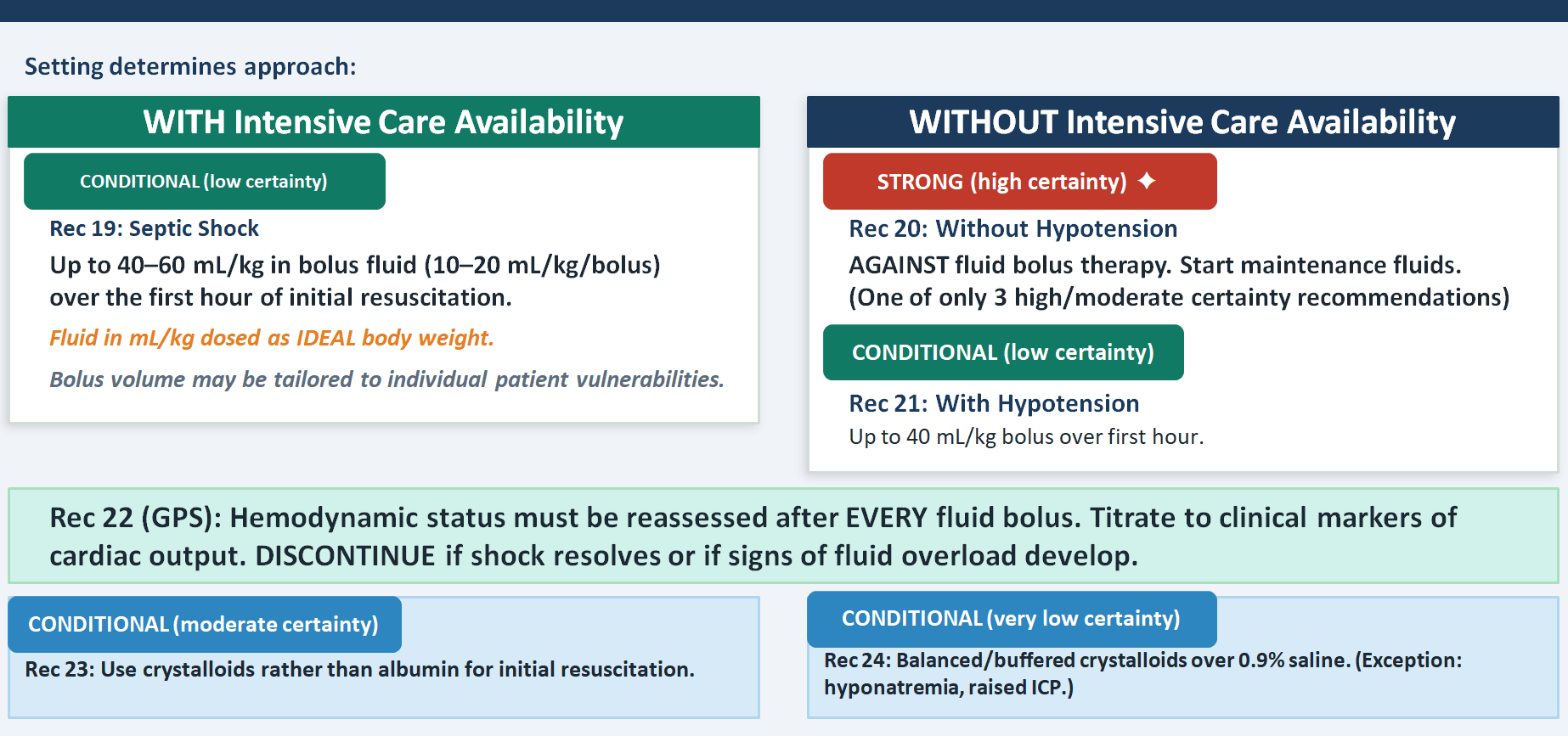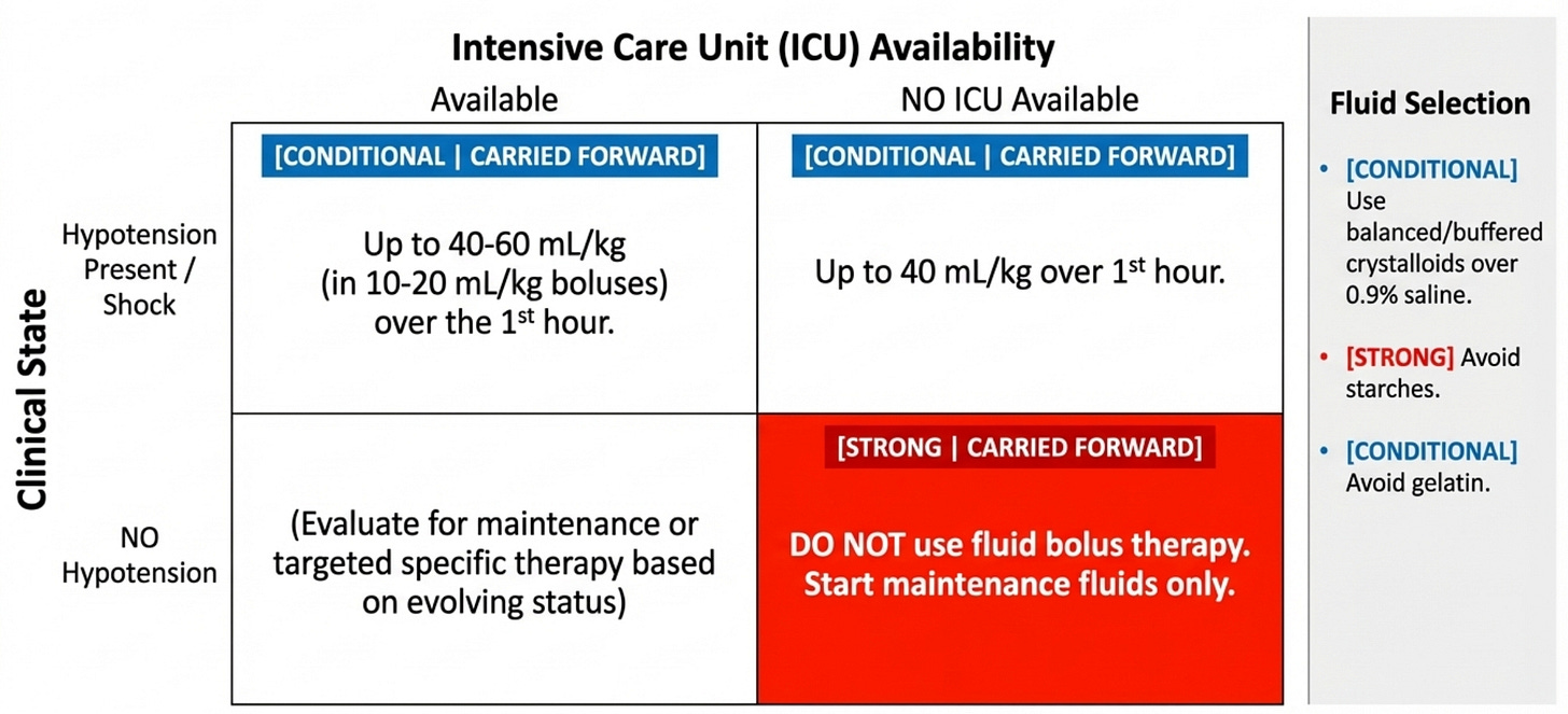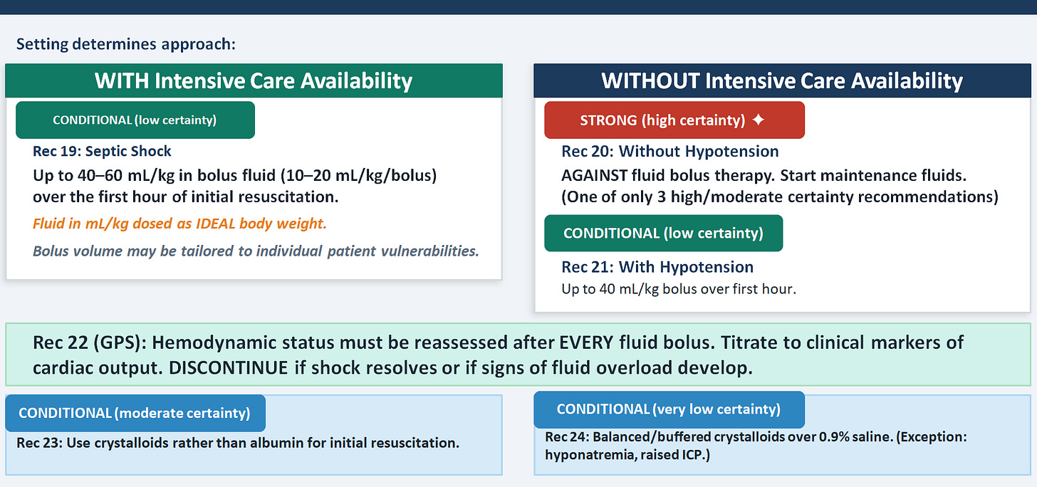 This is one of the most practically transformative recommendations . The strong recommendation against fluid boluses in the absence of hypotension in settings without intensive care availability (Rec 20) is one of only three recommendations in the entire guideline that rests on high certainty evidence — drawn from the FEAST trial and its legacy. This directly overturns decades of PALS teaching that "fill the tank first." In high-resource settings with ICU backup, the conditional recommendation for up to 40–60 mL/kg over the first hour remains, but it is accompanied by two important nuances: dose on ideal body weight, and individualize to patient vulnerabilities. The crystalloid versus albumin recommendation (moderate certainty) and the balanced versus saline recommendation are both conditional — meaning the answer changes with context: a child with hyponatremia or raised intracranial pressure may actually need 0.9% saline.