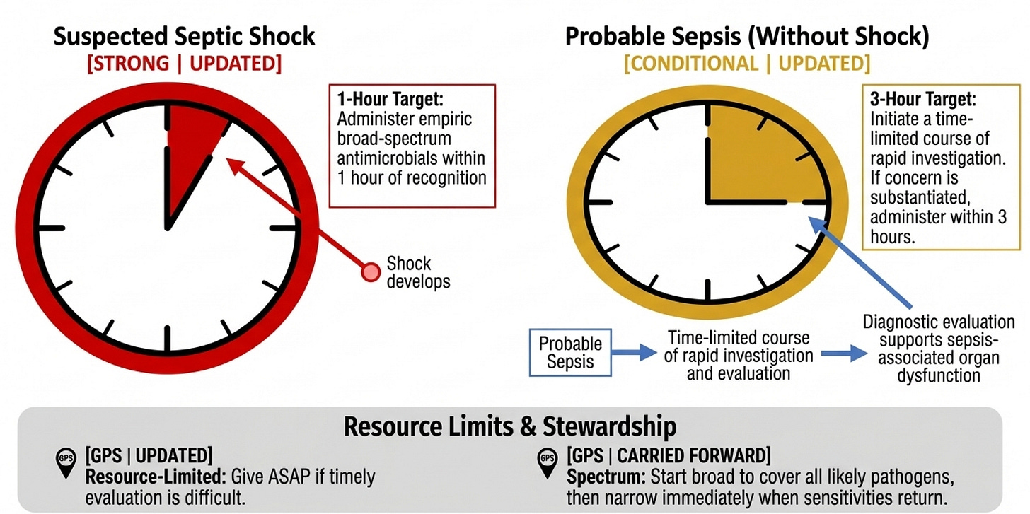 For septic shock: 1 hour, strongly, no equivocation. For probable sepsis without shock: 3 hours, but the panel deliberately inserts a "time-limited course of rapid investigation" — meaning you should be asking whether this is actually sepsis, whether this might be viral, whether an antibiotic is truly necessary. This nuance is clinically important and often lost in the rush to comply with time metrics. The panel even notes — explicitly — that both very early antibiotic administration (under 30 minutes) and very late administration (over 330 minutes) were linked to mortality compared with intermediate timing, which tells us that panic-driven, reflex prescribing is also harmful. The GPS for resource-limited settings acknowledges the real world: when diagnostic testing simply isn't feasible, give antibiotics as soon as possible.