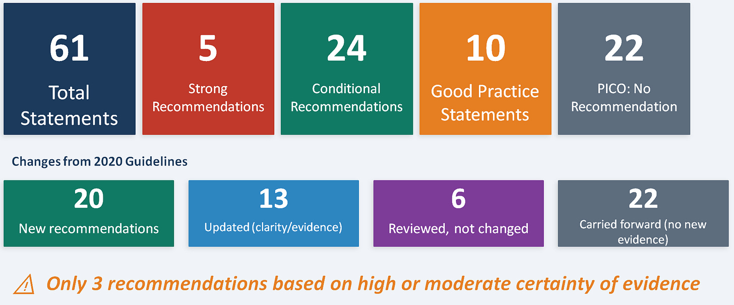 The primary teaching/learning point is that only 3 of 61 statements are based on high or moderate certainty evidence. The remaining statements rely on low, very low, or absent evidence. This reflects the current state of the field rather than a flaw in the guideline. The 2026 guidelines also demonstrate intellectual evolution: 20 recommendations are new, and 13 have been updated. The 22 statements carried forward without review indicate areas where no new evidence has emerged.