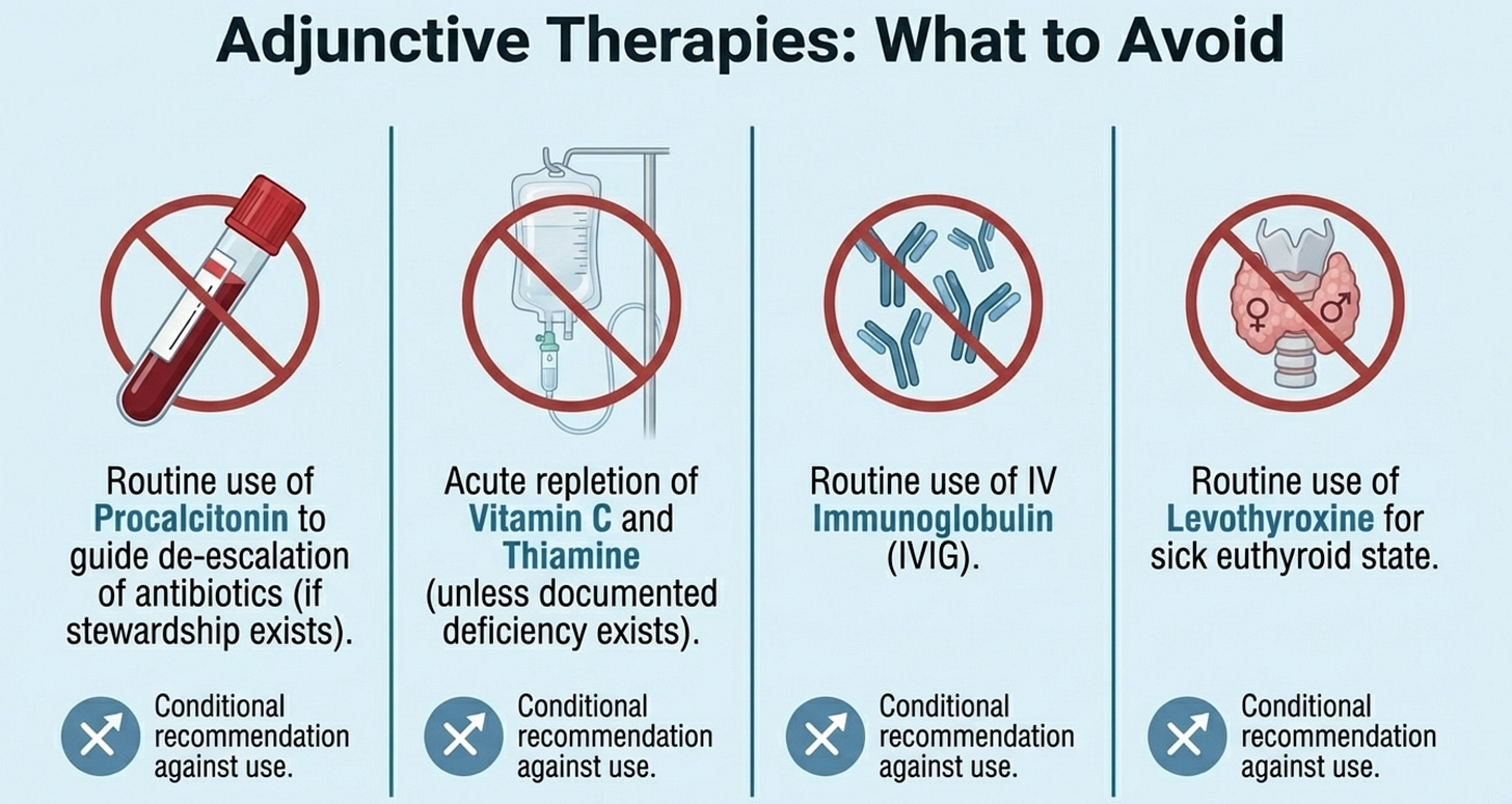 vitamin C (Rec 46), thiamine (Rec 47), and vitamin D (Rec 48) should not be used routinely in pediatric sepsis. The VITACiPS RCT for vitamin C (n=218) and the RESPOND PICU trial for vitamin C + thiamine + hydrocortisone (n=60) both showed no benefit on organ dysfunction, shock reversal, or mortality. What makes this teaching-worthy is not the negative result itself but the important exception the panel preserves: in patients with documented or suspected deficiency — particularly malnourished children — vitamin C and thiamine repletion may still be appropriate. This prevents the guideline from being applied as a blanket prohibition when genuine nutritional deficiency is present.