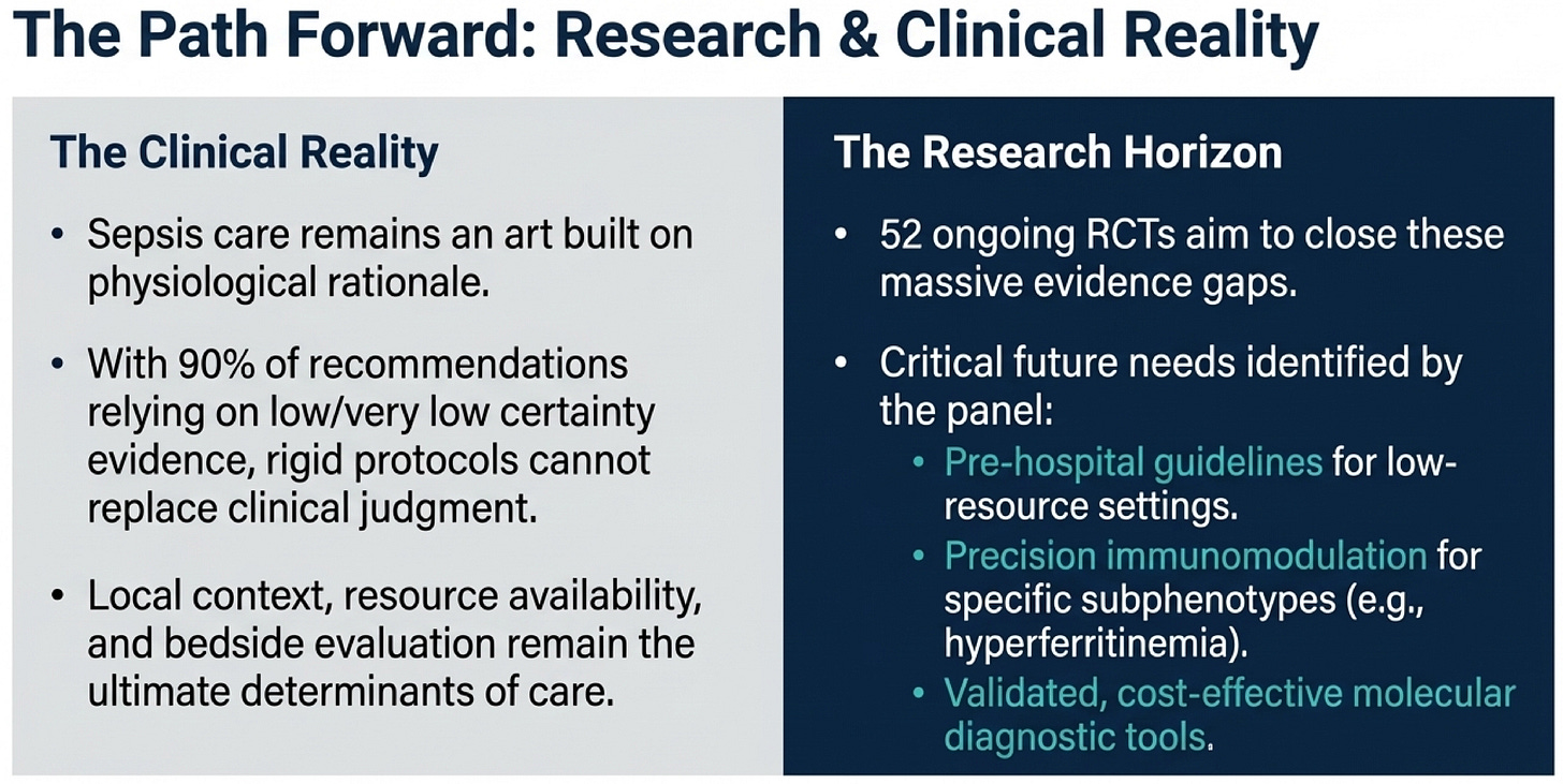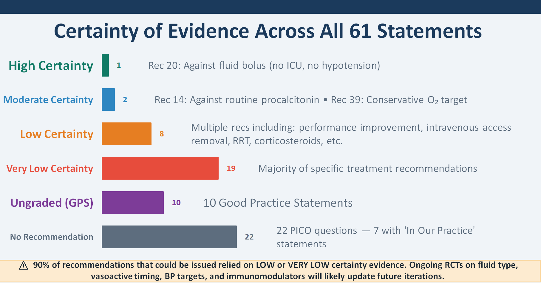 This should be shown to anybody who interprets a guideline recommendation as equivalent to proven efficacy. While summary statistics suggest low certainty, the visual presentation clarifies the extent: 19 of 61 statements are based on very low certainty evidence, and 22 PICOs yielded no recommendation at all. Epistemologically, this indicates that much of pediatric sepsis management derives from biological plausibility, adult data, and expert consensus rather than rigorous pediatric randomized trials. The panel explicitly identifies ongoing and needed trials—including PRoMPT BOLUS, SQUEEZE, and immunostimulant trials—as a research agenda.