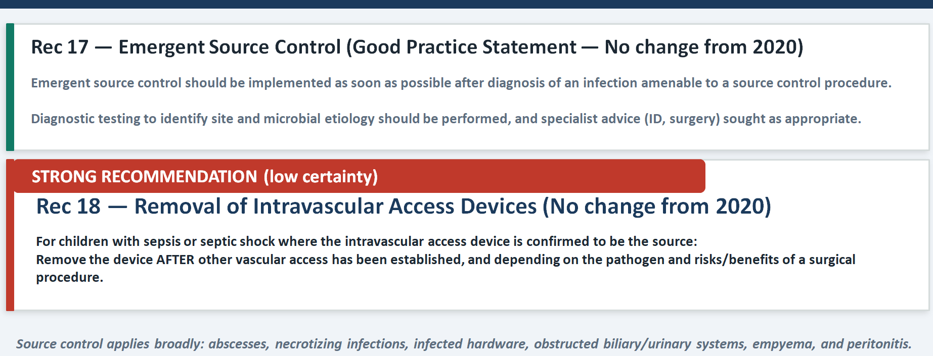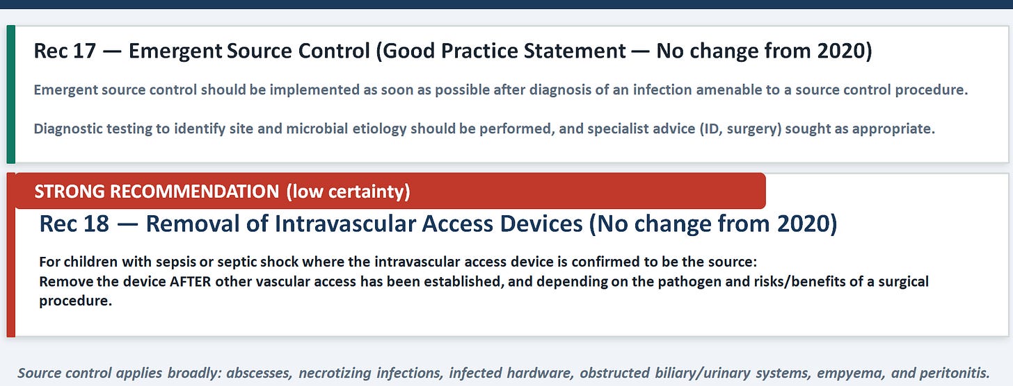 No amount of fluid and antibiotics will rescue a child whose source has not been controlled. The strong recommendation to remove infected intravascular access devices (Rec 18) carries low certainty of evidence but was issued as a strong recommendation because the logic is biologically unassailable — you cannot cure catheter-related bacteremia while leaving the catheter in place. The practical teaching point is that source control decisions require multidisciplinary judgment: the treating clinician must engage surgery and infectious diseases early, and the risks of the procedure must be weighed against the risks of leaving the source untreated.