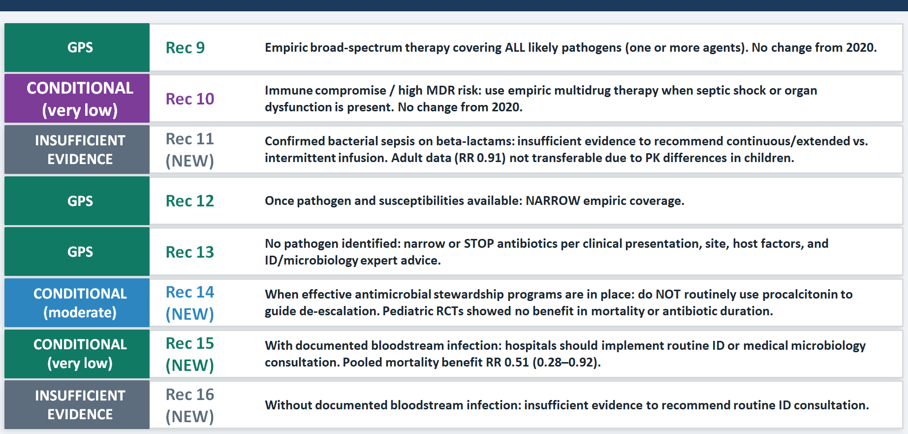 A new recommendation on procalcitonin (Rec 14), which is a conditional recommendation against its routine use for de-escalation when effective stewardship programs are already in place. This is counterintuitive to many, because procalcitonin has been widely promoted. But the pediatric RCTs showed no benefit in mortality or antibiotic duration when compared with mature antimicrobial stewardship infrastructure — and this is the key qualifier. Procalcitonin may add value where stewardship is weak, but where it is strong, the biomarker adds cost without benefit. The second important message is the new conditional recommendation for routine infectious diseases consultation when bloodstream infection is documented (Rec 15), with a pooled mortality benefit of RR 0.51. This is strong enough to be a service delivery argument: ID consultation should be the institutional standard for bacteremia, not an optional referral.