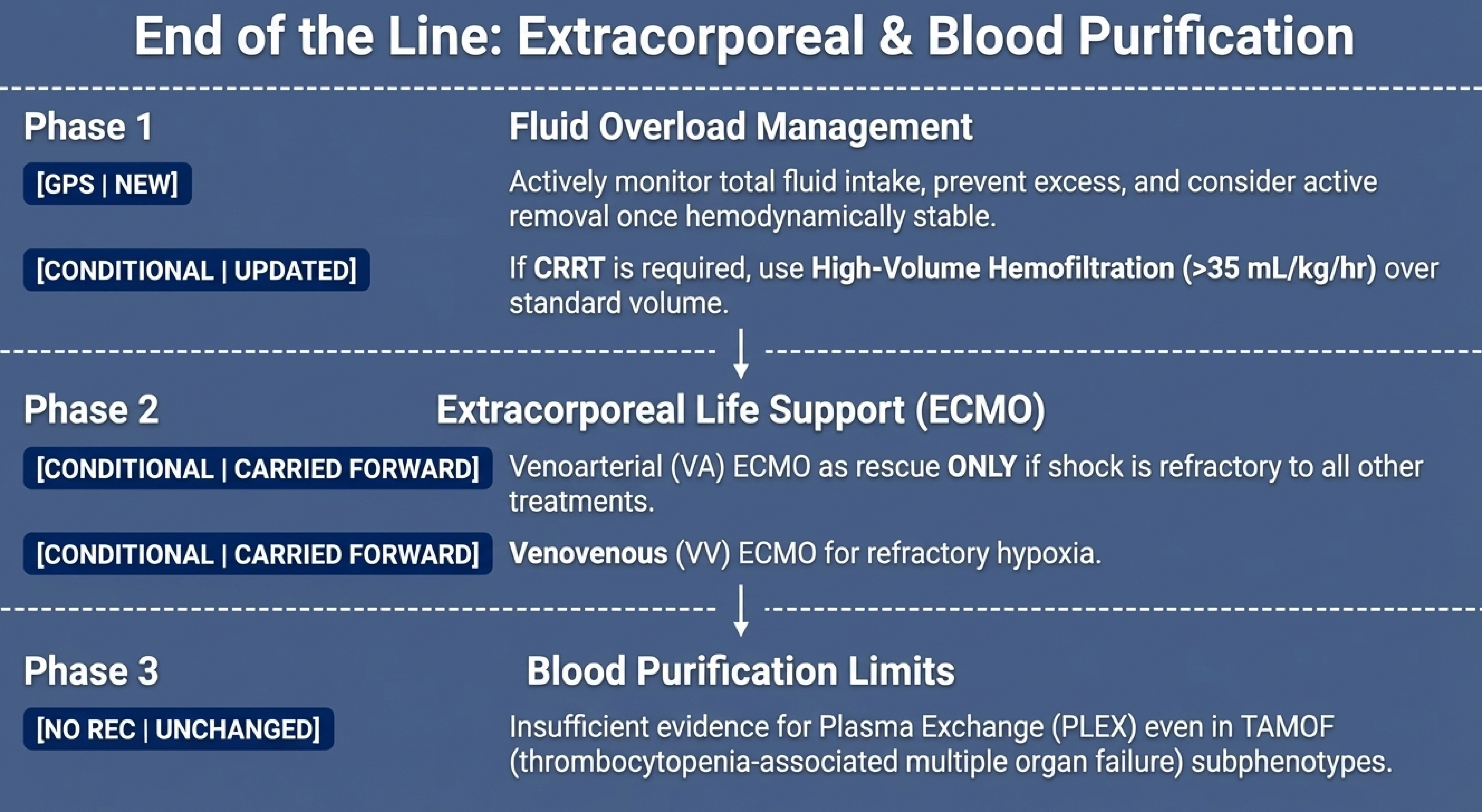 The most significant reversal from 2020 is the HVHF recommendation (Rec 50): the 2020 guidelines suggested against high-volume hemofiltration, while the 2026 guidelines now conditionally recommend it over standard-volume hemofiltration. The new meta-analysis of three RCTs (n=195) shows a mortality benefit (RR 0.58) and shorter RRT duration. However, students and practitioners should understand the caveats: all three trials used continuous venovenous hemofiltration (CVVH) specifically, the evidence base is still small, and this is only applicable where CRRT infrastructure exists. The GPS on fluid overload management (Rec 49) is architecturally important: it frames fluid removal as a proactive strategy once hemodynamic stability is achieved, not a reactive crisis measure — and 64% of panelists already do this in practice.