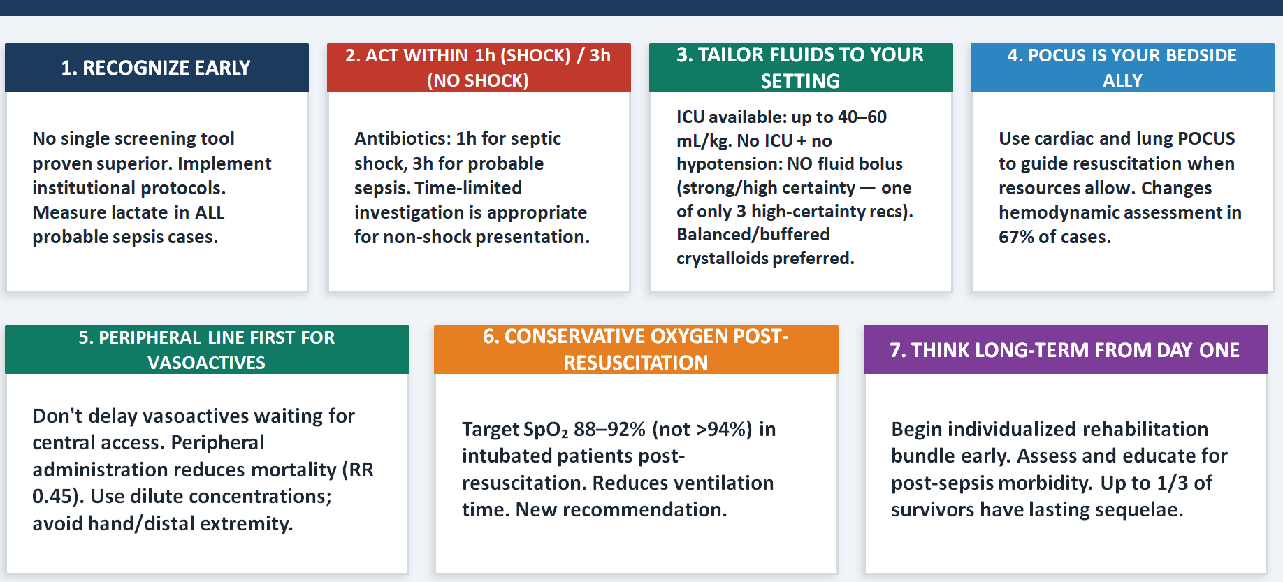 Each of the seven pearls represents a node where the guideline either changed practice or reinforced it with new evidence. The most counterintuitive three — worth specifically teaching — are the retreat from universal screening, the embrace of peripheral access for vasoactives, and the conservative SpO₂ target of 88–92%. These three challenge instincts that have been deeply embedded in training for decades.