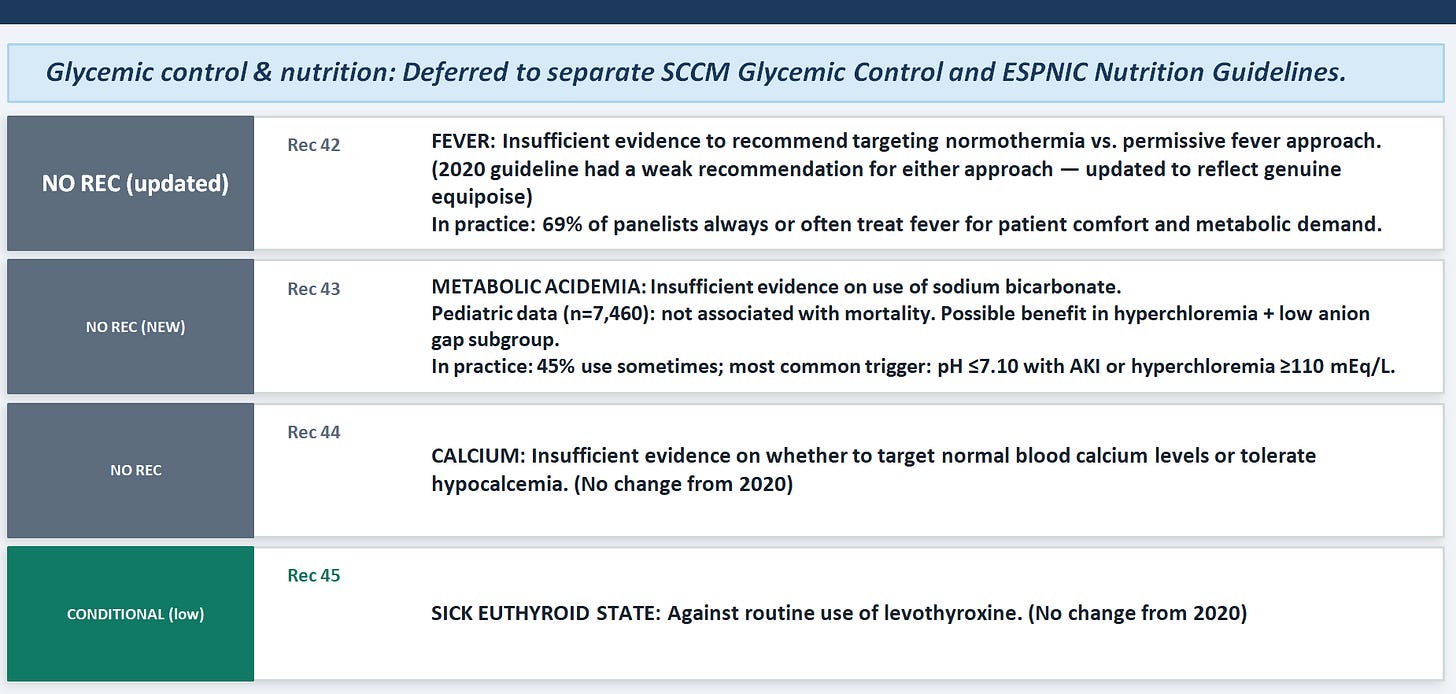 The most important conceptual update is what happened to the fever recommendation: the 2020 guideline had a weak recommendation for either antipyretic therapy or a permissive approach — meaning the panel believed there was enough evidence to gesture toward clinical flexibility. By 2026, even that weak gesture has been withdrawn, replaced by "insufficient evidence." This is a downgrade, and it reflects the genuine equipoise the panel acknowledges: fever has evolutionary survival value (inhibiting pathogen growth, potentiating cellular immunity), but whether that benefit persists in the altered physiology of sepsis is unknown. For sodium bicarbonate in metabolic acidemia (Rec 43, new), the take-home is that the data are truly uncertain — the retrospective pediatric cohort of over 7,000 children showed no overall mortality benefit, with a possible benefit only in the hyperchloremia/low-anion-gap subgroup, suggesting that the biochemical context in which you use bicarbonate matters profoundly.